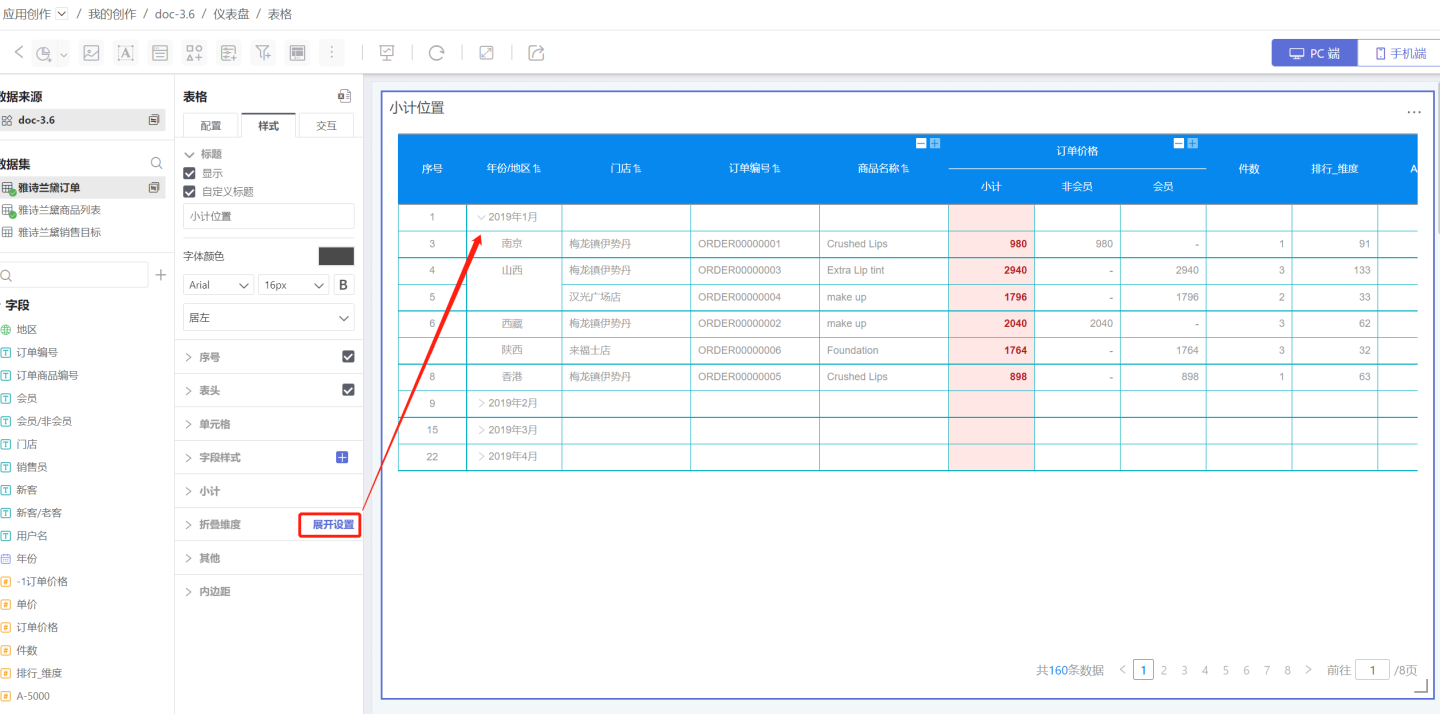 表格支持小计包括位置、字体颜色、对齐方式、背景色等,每个小计可单独设置。小计在表格统计时占一行。