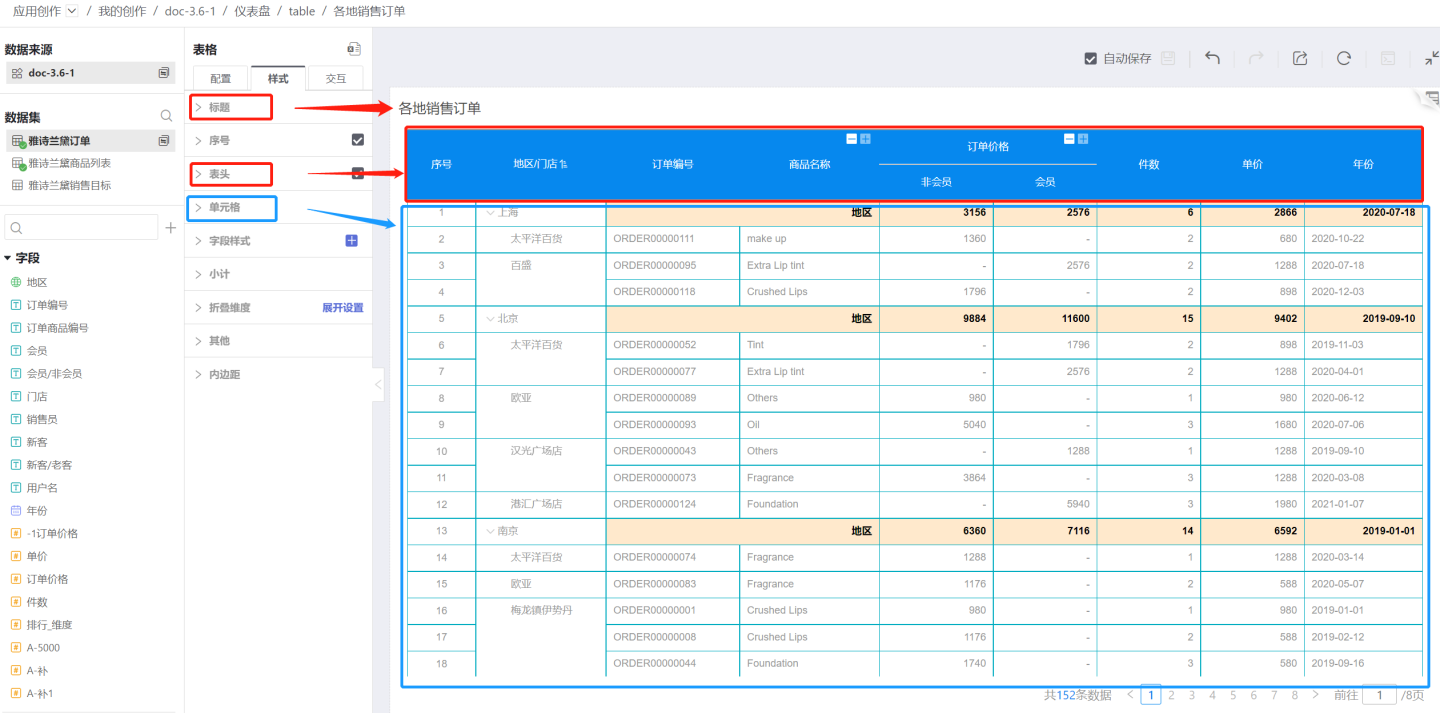 表格支持标题、序号、表头、单元格、字段样式、小计、折叠维度、以及其他辅助功能的设置。下面详细介绍每种样式的功能和展现效果。