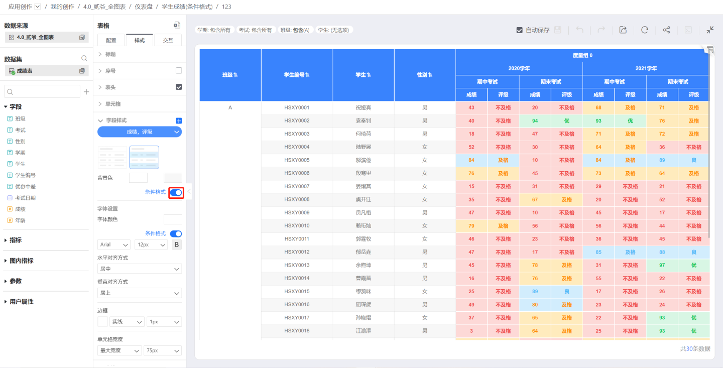 条件格式指通过设置条件来渲染单元格的颜色。单元格的背景和字体都支持设置条件格式,从而使单元格更加突出,用户通过颜色就可以找出符合条件的数据。 如学生成绩单中,绿色的表示成绩在90分以上,蓝色的表示成绩在80分以上。 条件格式可以控制某一字段的展示,也可以控制某一行数据的展示。下面介绍条件格式的相关配置。