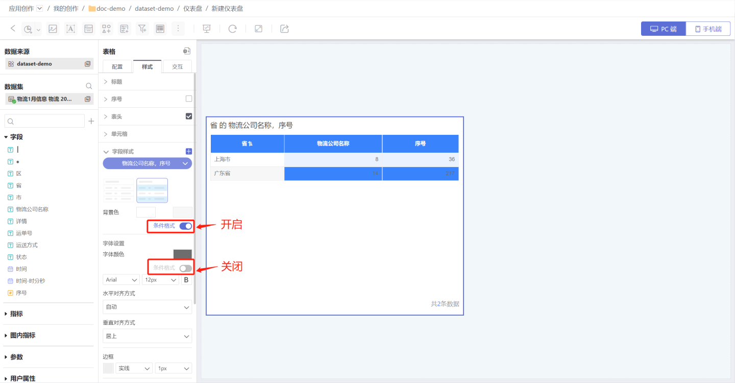 文字设置 支持设置字体、字体颜色、字号、加粗,字体颜色支持条件格式设置。