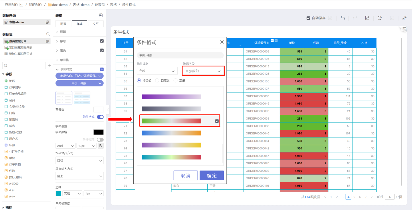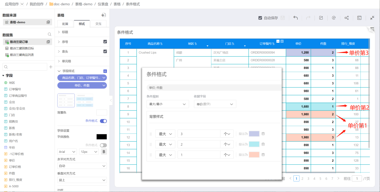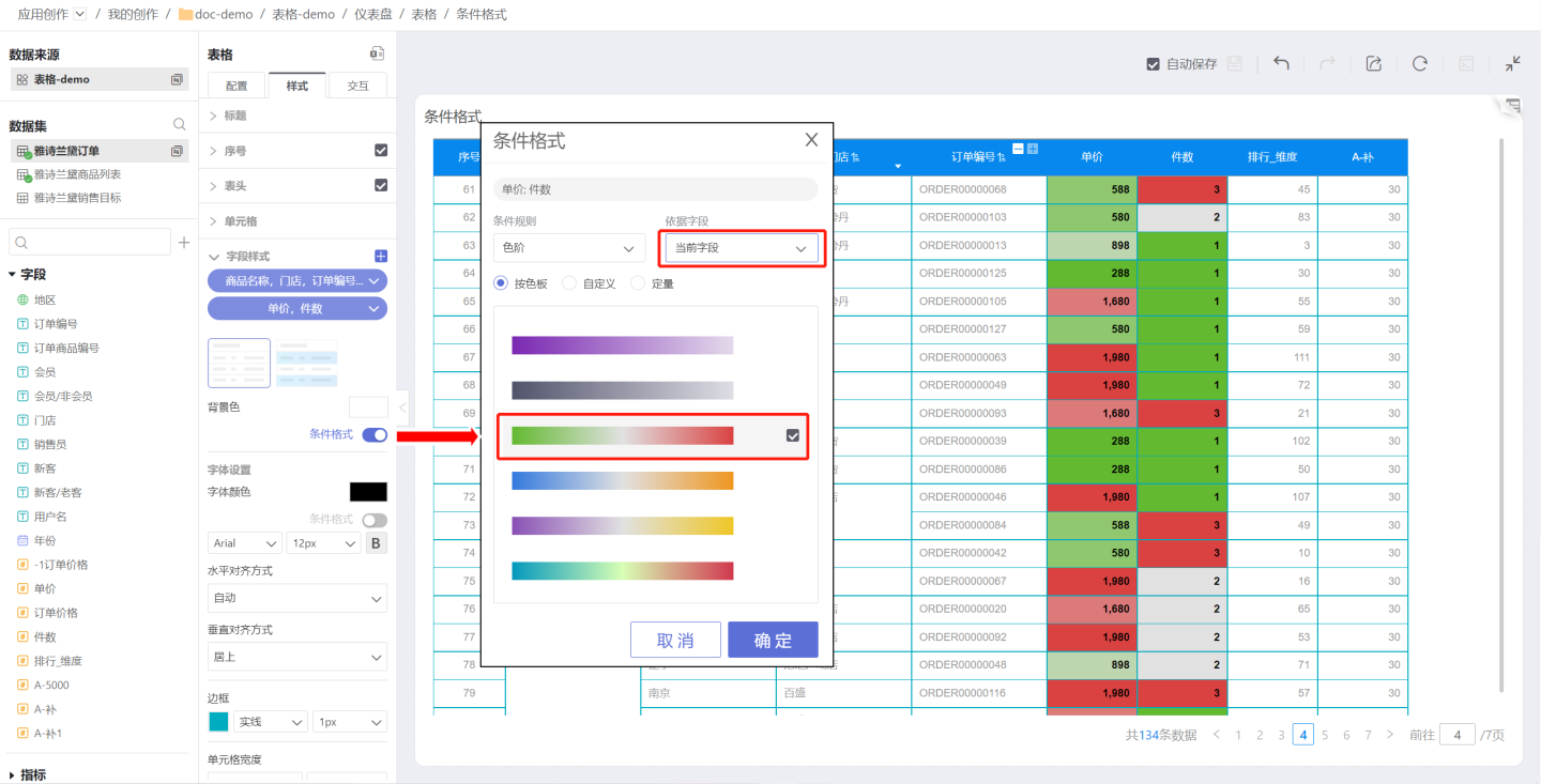 当前字段: 当依据字段设置为当前字段,表示该字段样式中的每个字段依据其自身的值进行条件格式渲染。 如示例中的字段样式使用当前字段作为依据字段,则每个字段以字段自身的值作为依据。单价字段对应的色阶数值为288~1980,件数字段对应的色阶数值为1~3。 可以看出单价字段中最高(红色)为1980, 件数字段中最多(红色)是3。