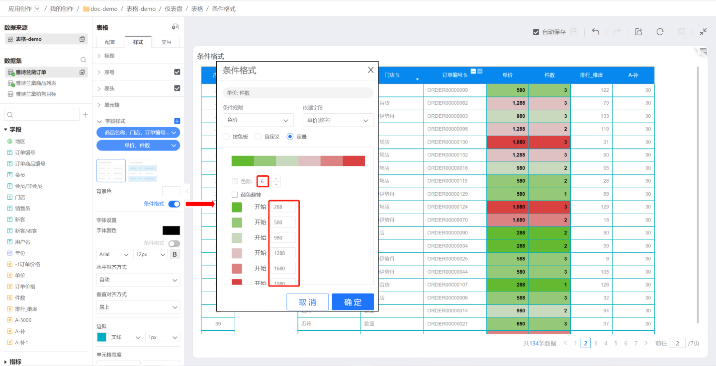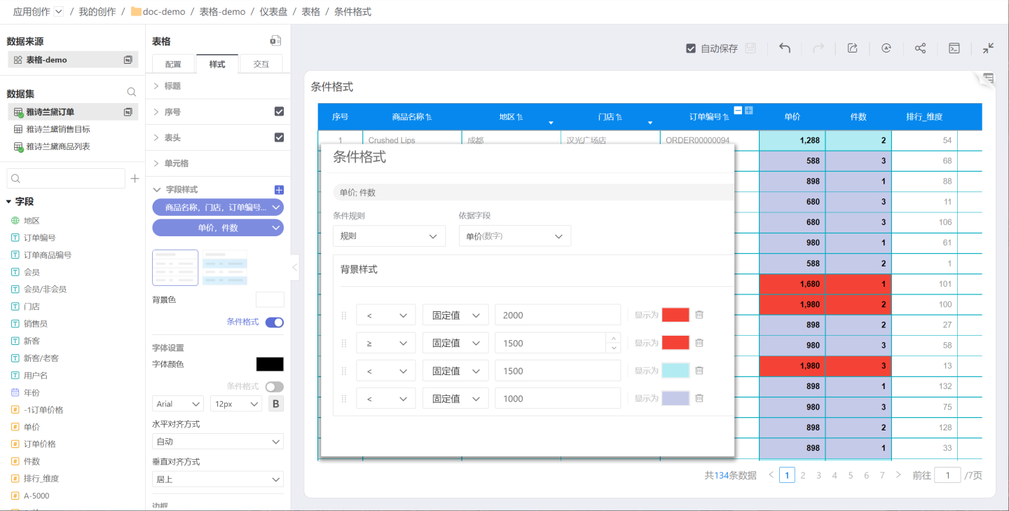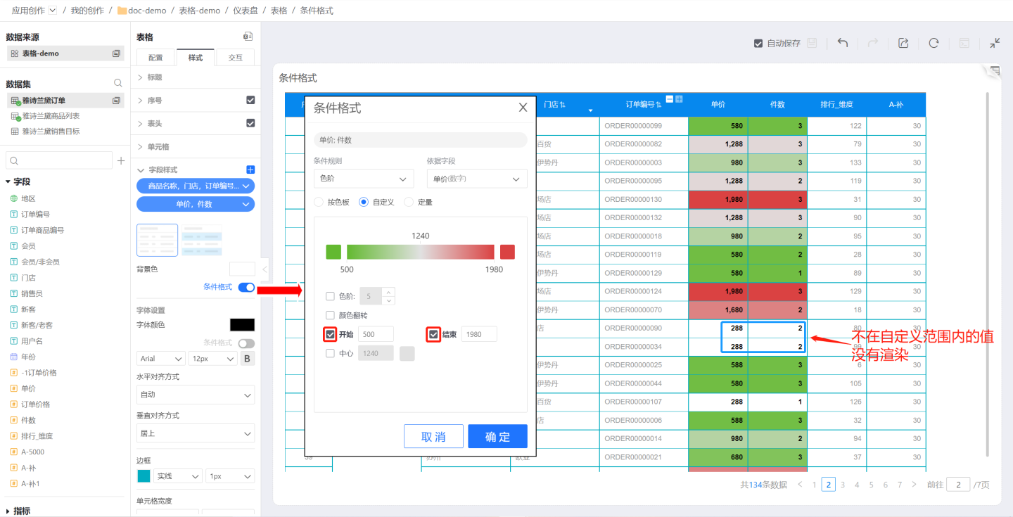 当前字段: 当依据字段设置为当前字段,表示该字段样式中的每个字段依据其自身的值进行条件格式渲染。 如示例中的字段样式使用当前字段作为依据字段,则每个字段以字段自身的值作为依据。单价字段对应的色阶数值为288~1980,件数字段对应的色阶数值为1~3。 可以看出单价字段中最高(红色)为1980, 件数字段中最多(红色)是3。