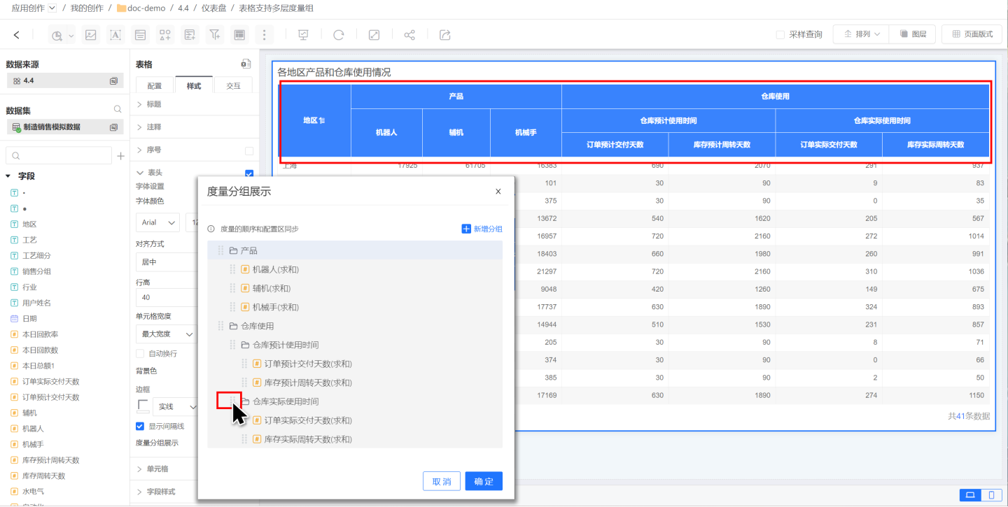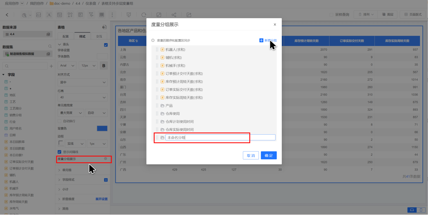 编辑框中通过拖拽度量信息,调整度量分组展示层级,将字段之间的多层级关系展示出来。