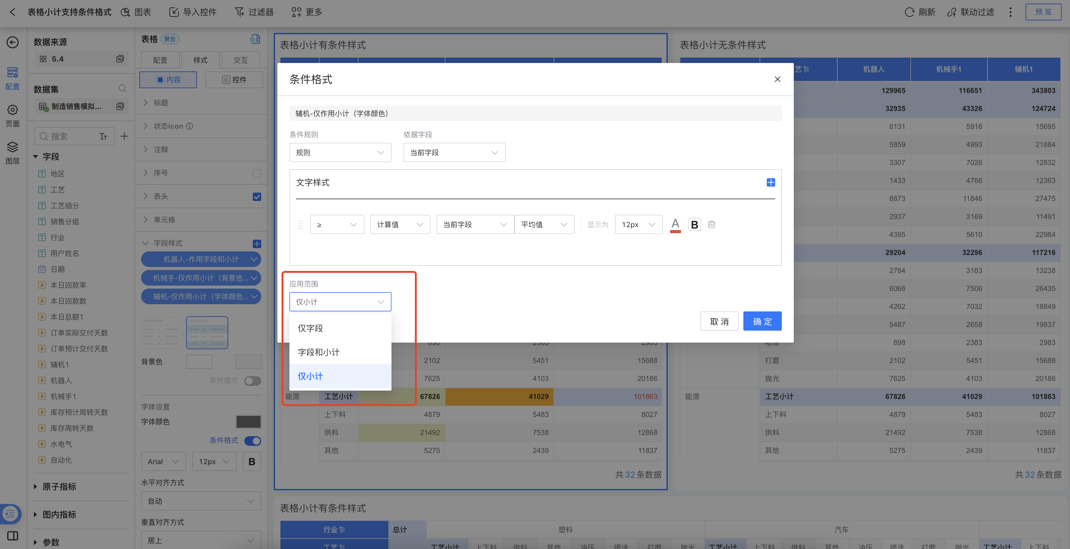 选择「仅小计」:条件格式只对小计值生效,不对字段数据生效。