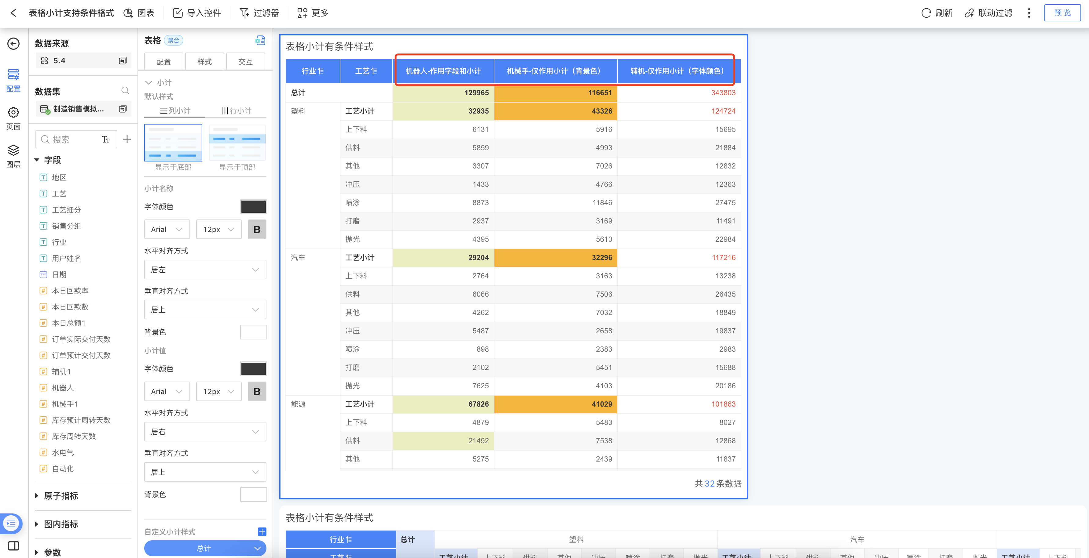 3.数据分析师制作表格时,想对表格小计值设置条件格式,5.4版本中在「字段样式」中支持对所选字段的数据和小计值配置条件格式。配置路径:样式>内容>字段样式>条件格式>应用范围。