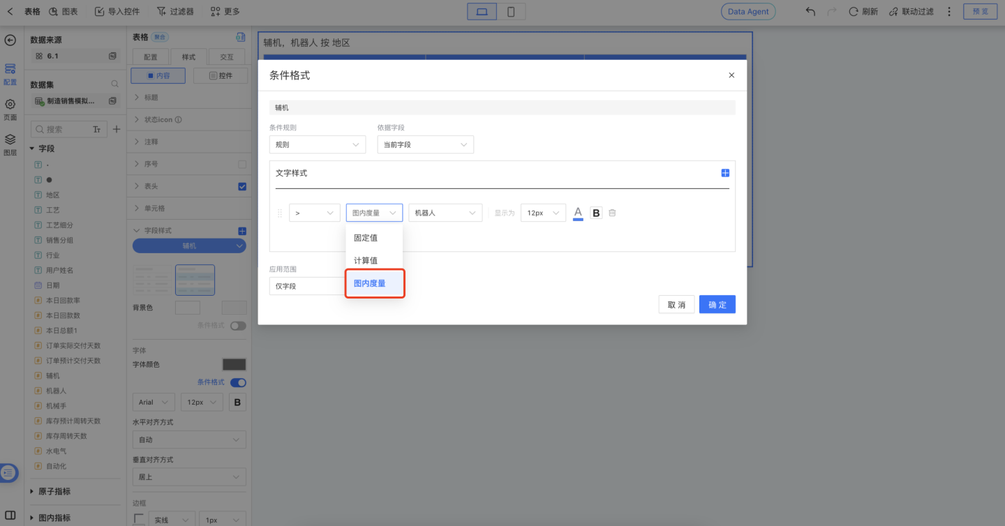 表格和画布表格的字段条件格式支持两个度量字段之间的单元格值比较,配置方式为在条件规则中,选择图内度量比较,选择需要比较的字段即可实现对比效果,适合场景如预期目标与实际达成的值的对比。