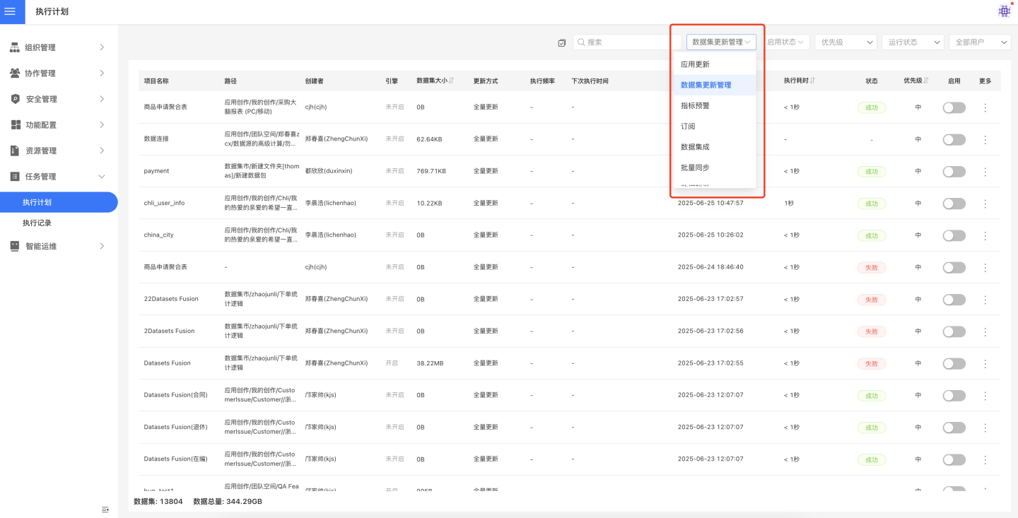 任务管理中包含应用更新、数据集更新、指标预警、订阅、数据集成、批量同步、数据科学、智能数据学习、智能数据分词、业务指标主题向量化十类任务。上述任务在设置执行计划后,无论是否启用计划都可以在任务管理中查看其状态和运行情况。