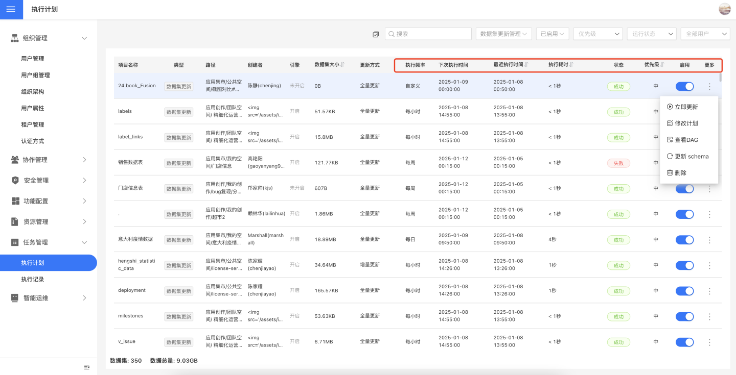 执行计划支持对任务进行启用、关闭、立即执行、修改计划、删除计划、查看 DAG 等操作,方便任务的责任人或系统管理员针对任务进行监控和必要的管理。数据集更新类型的任务还支持更新 schema 操作。