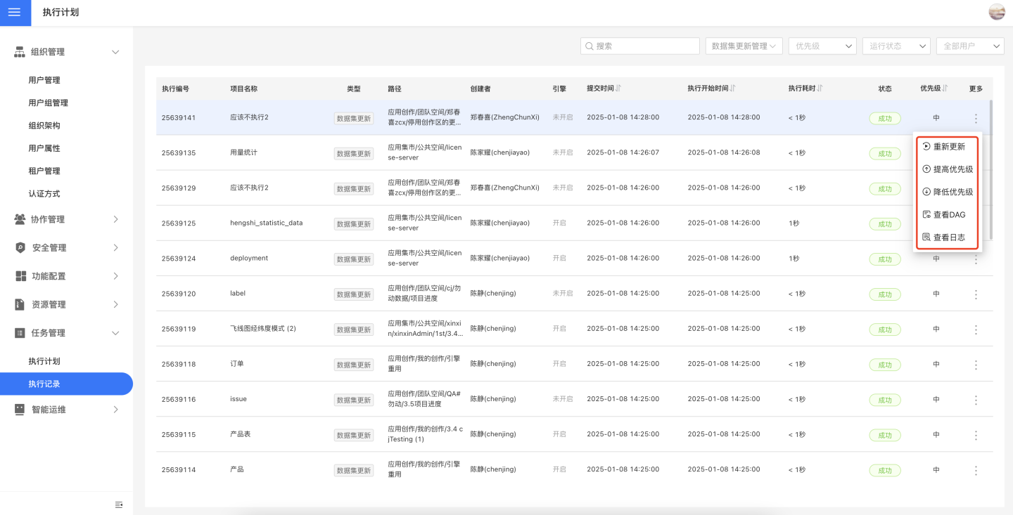 执行记录中支持对任务设置重新运行、提高优先级、降低优先级、查看 DAG、查看日志等操作。