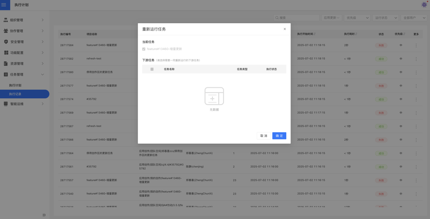 在任务三点菜单中点击重新更新,弹出重新运行任务设置界面,可以设置重新运行当前任务和当前任务的下游任务。设置重新运行的任务会立即执行,进入到任务执行队列中。
