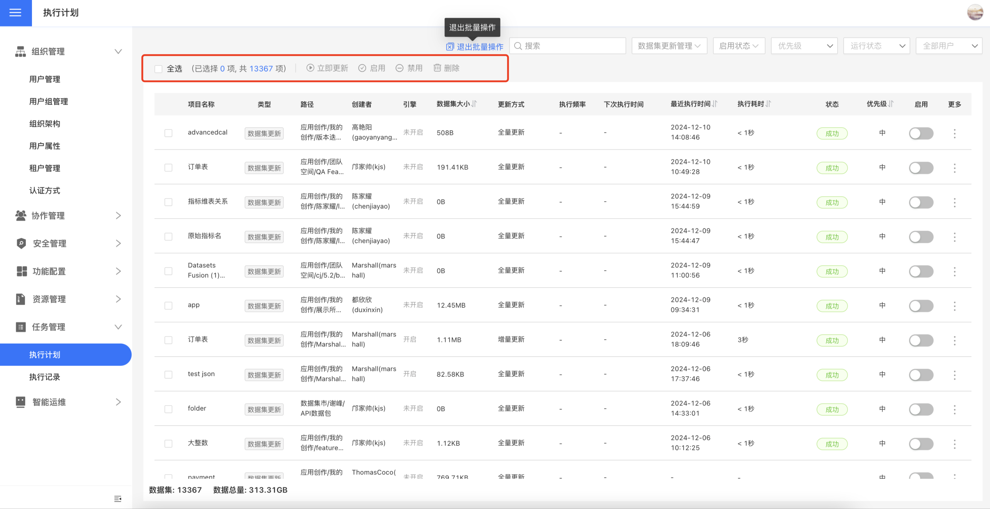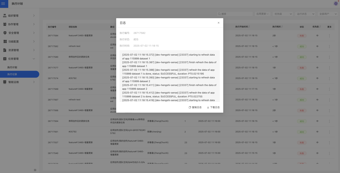 任务管理可以查看任务状态、执行记录、修改执行计划等。 普通用户可以查看并管理自己拥有的全部执行计划,系统管理员(拥有系统管理角色的用户)可以查看、修改和删除所有资源的执行计划,对系统运维资源进行统一管理。