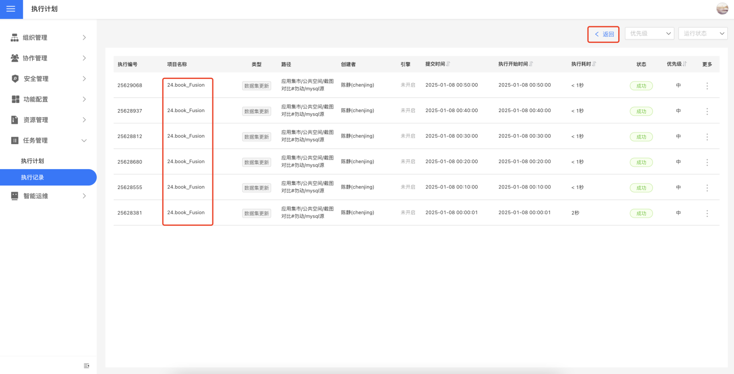 - 在执行计划页面内点击任务,进入该任务的执行记录列表页,展示近30天内该任务执行记录情况,点击返回按钮回到执行计划页面。