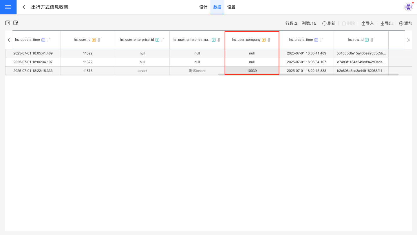 平台方可以在表单数据中查看租户填报内容,hs_user_company 是租户 ID,其中 hs_user_company 不为空的记录是租户填写的。更多系统字段说明参考表单数据。