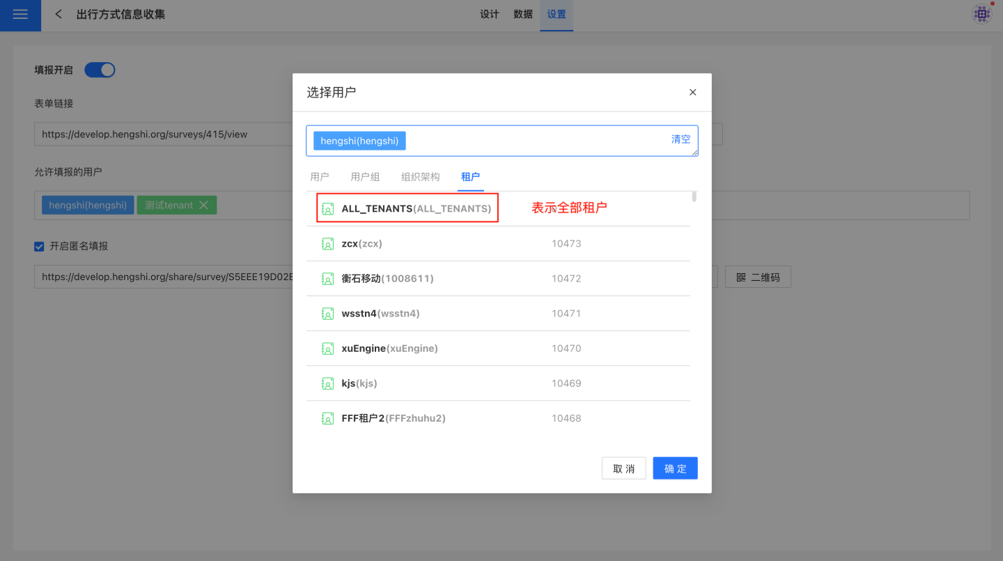 平台方在表单设置中添加租户信息,允许租户填报。其中 ALL_TENANTS 代表所有租户,也可以输入租户名。