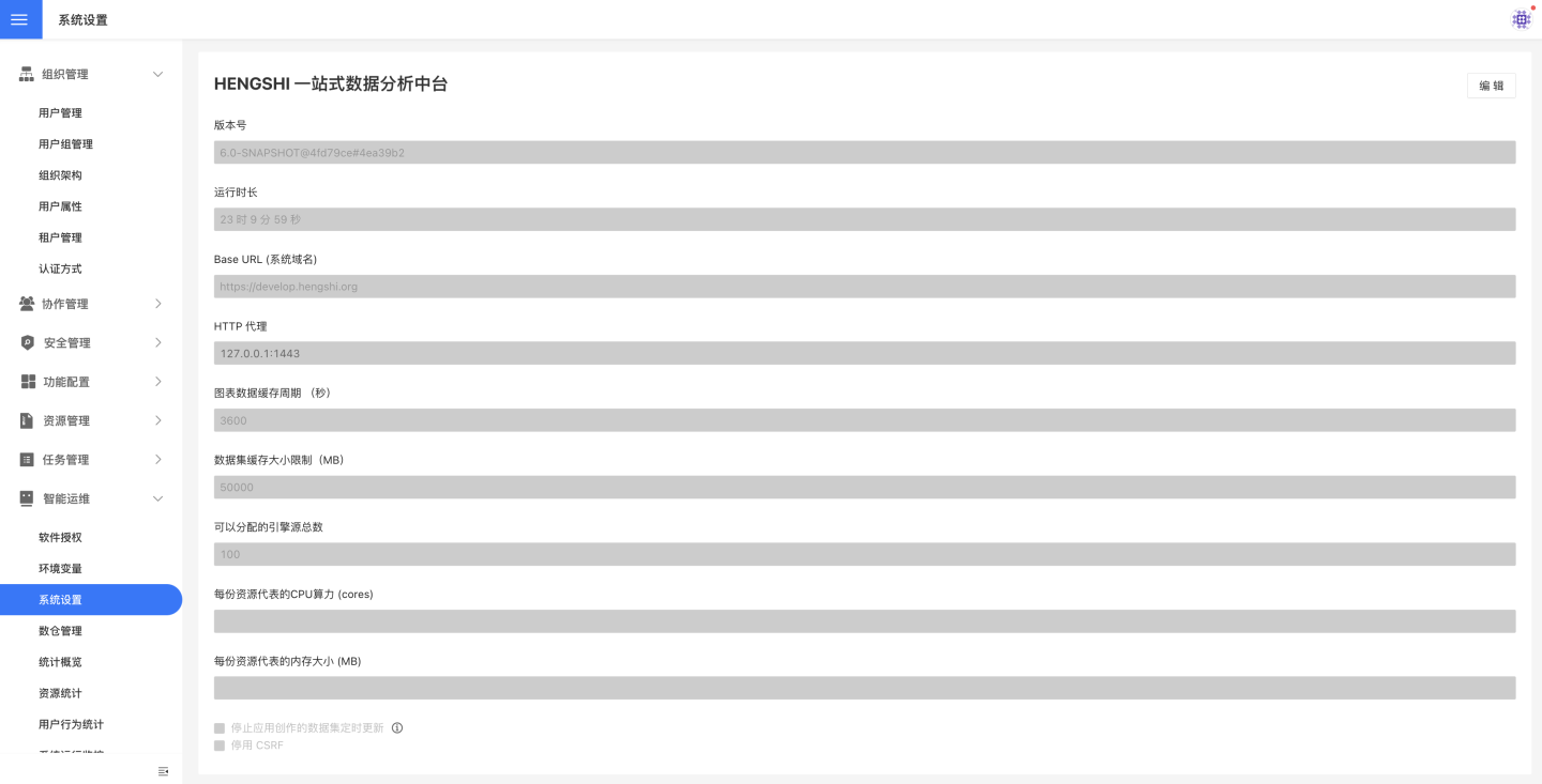 租户引擎可以在系统设置中进行设置,如图配置引擎分配总数后,系统自动计算出每份资源代表的 CPU 算力和每份资源代表的内存大小。 目前引擎总数是100,不支持修改。