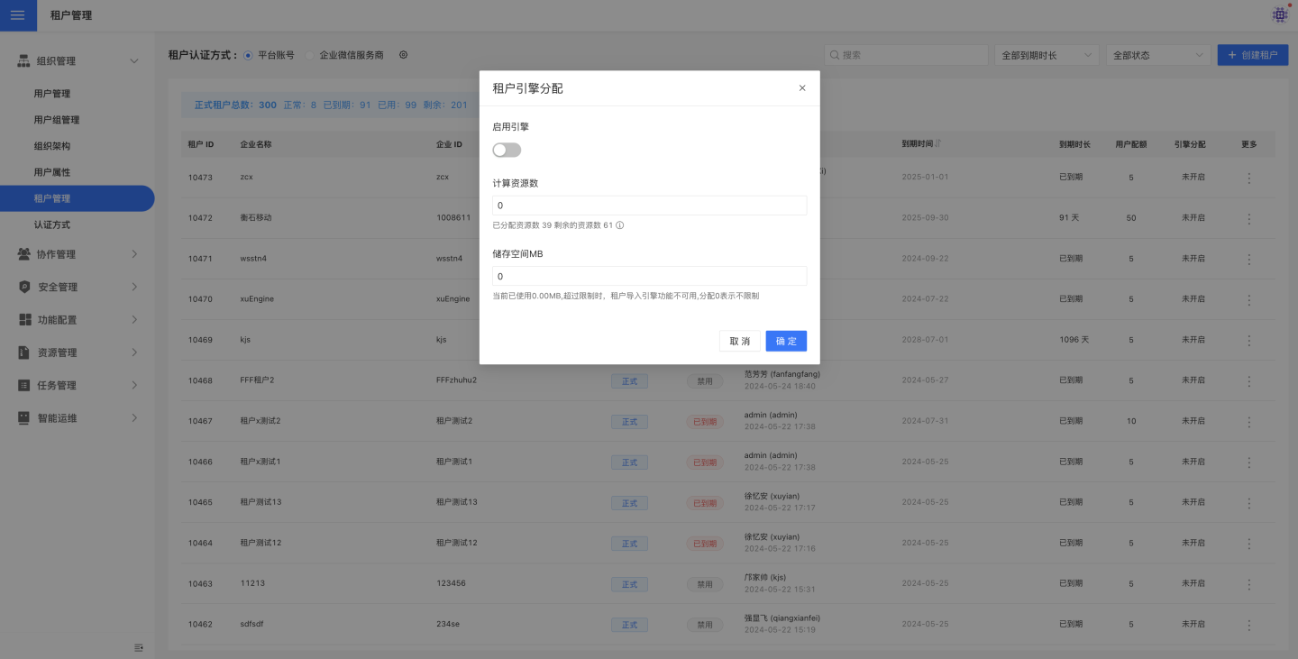 平台方可以为租户分配引擎。每个租户独立使用引擎。如图,在租户引擎分配弹窗中设置租户分配资源数。