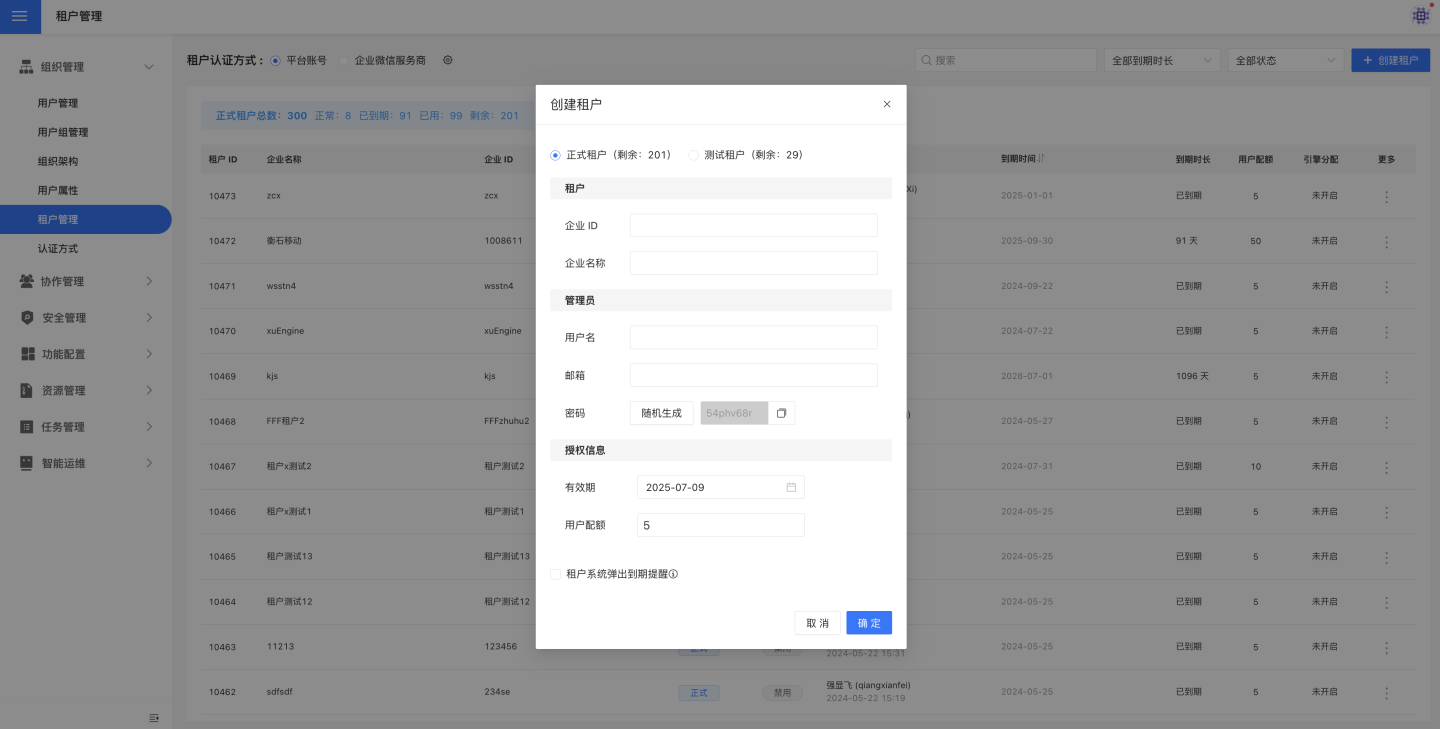 在设置->组织管理->租户管理中,点击新建租户,在新建租户弹窗中填写租户信息包括企业 ID、企业名称,管理员信息用户名、邮箱,服务信息包括有效期和用户配额,设置租户系统到期提醒。