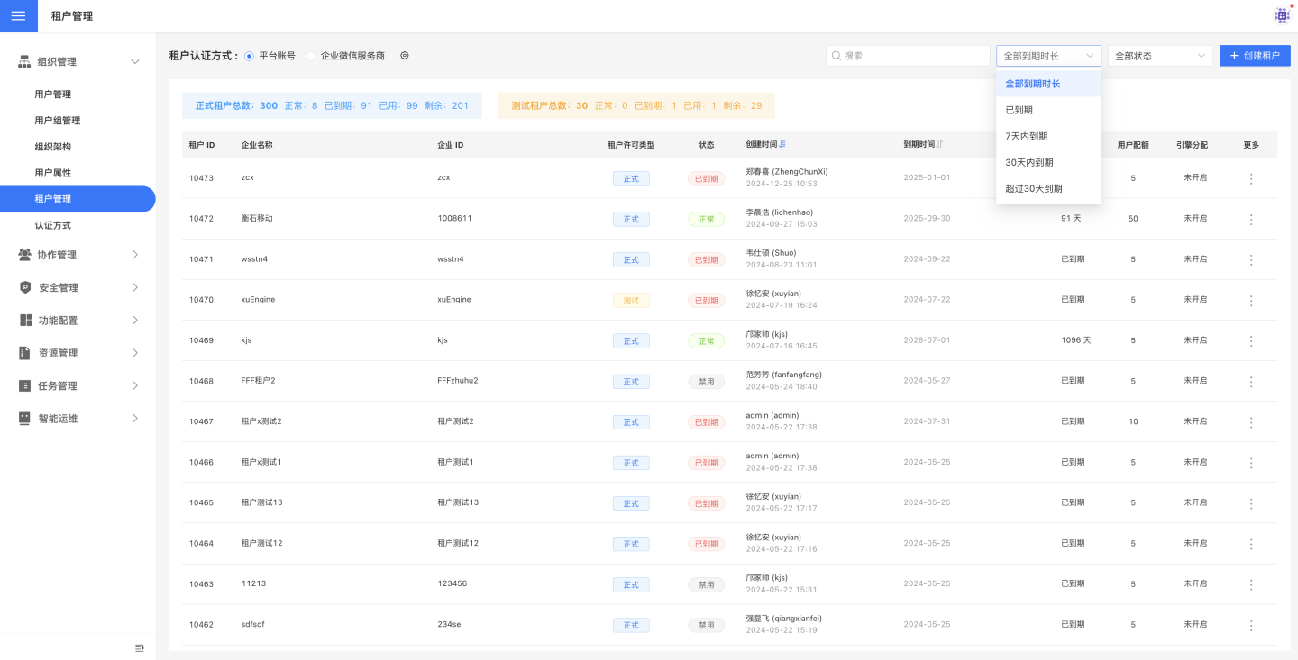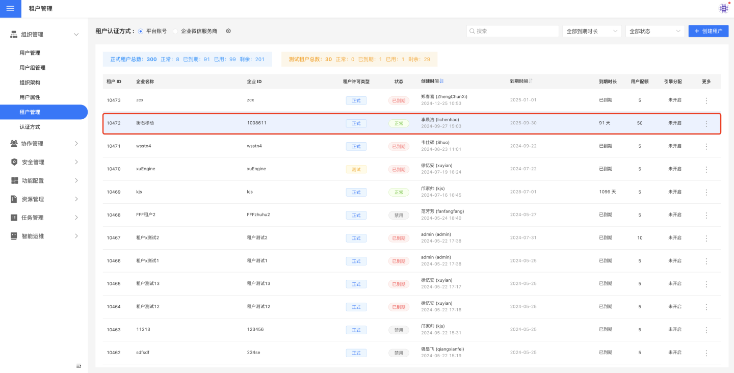 平台方在租户管理中创建管理租户,查看租户信息(状态、到期时间、租户用户上限、引擎分配),可以通过租户到期时间和租户状态查询租户。