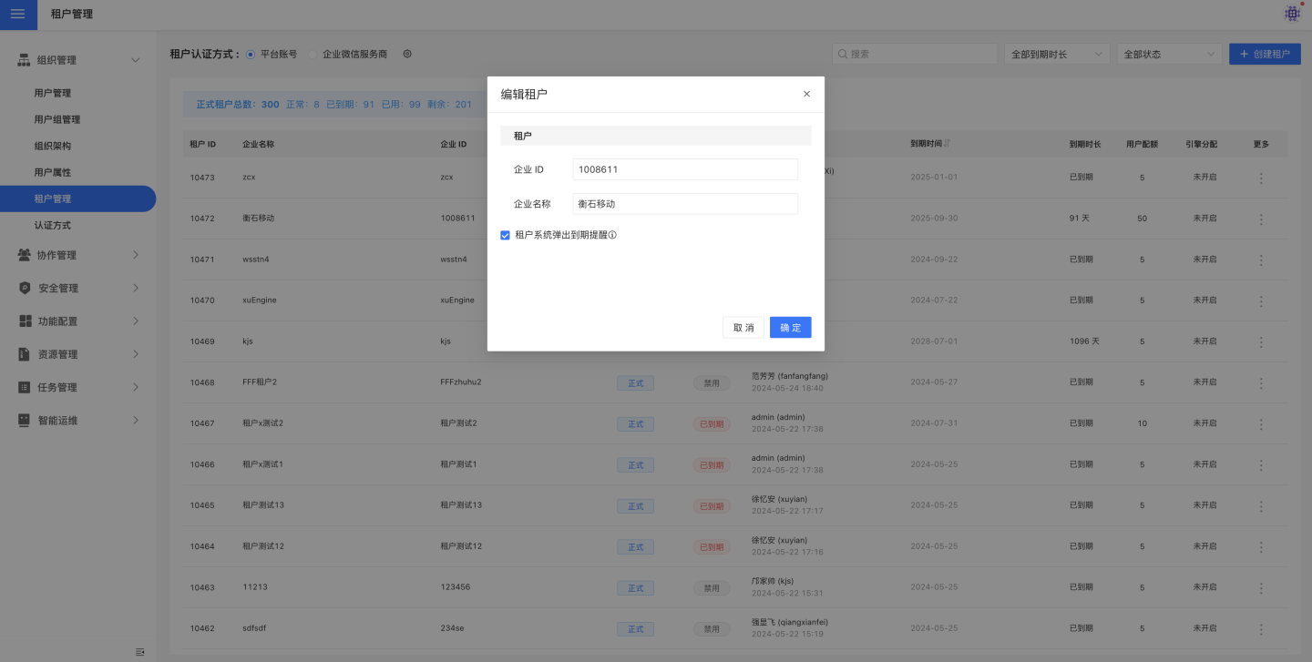 租户创建后,可以进行编辑,修改租户的企业 ID、企业名称、租户系统到期提醒。