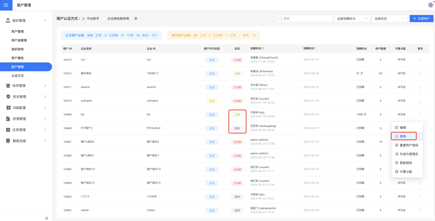 租户创建后处于启用状态,平台方可以禁用租户,禁用后租户系统的用户将无法登录。
