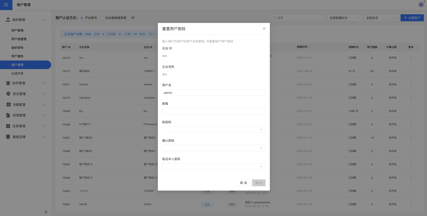 平台方可以重置租户系统内用户的密码,该功能用于租户内所有用户都忘记密码不能登录到租户系统,该功能适用于极端场景,一般情况不会使用。