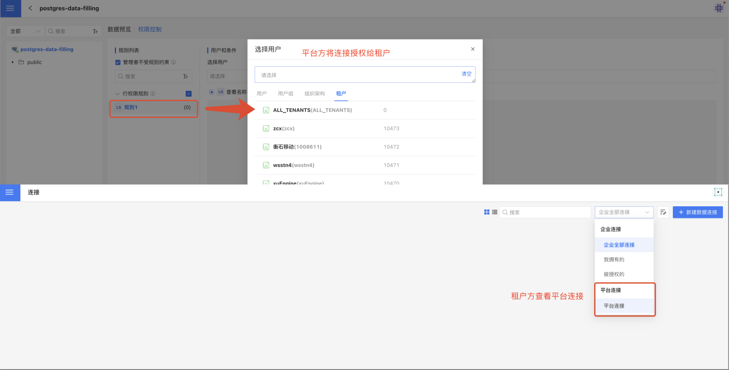 平台方通过在数据连接中建立规则将连接数据授权给租户。租户用户可以在数据连接模块的平台连接中查看平台方的资源。
