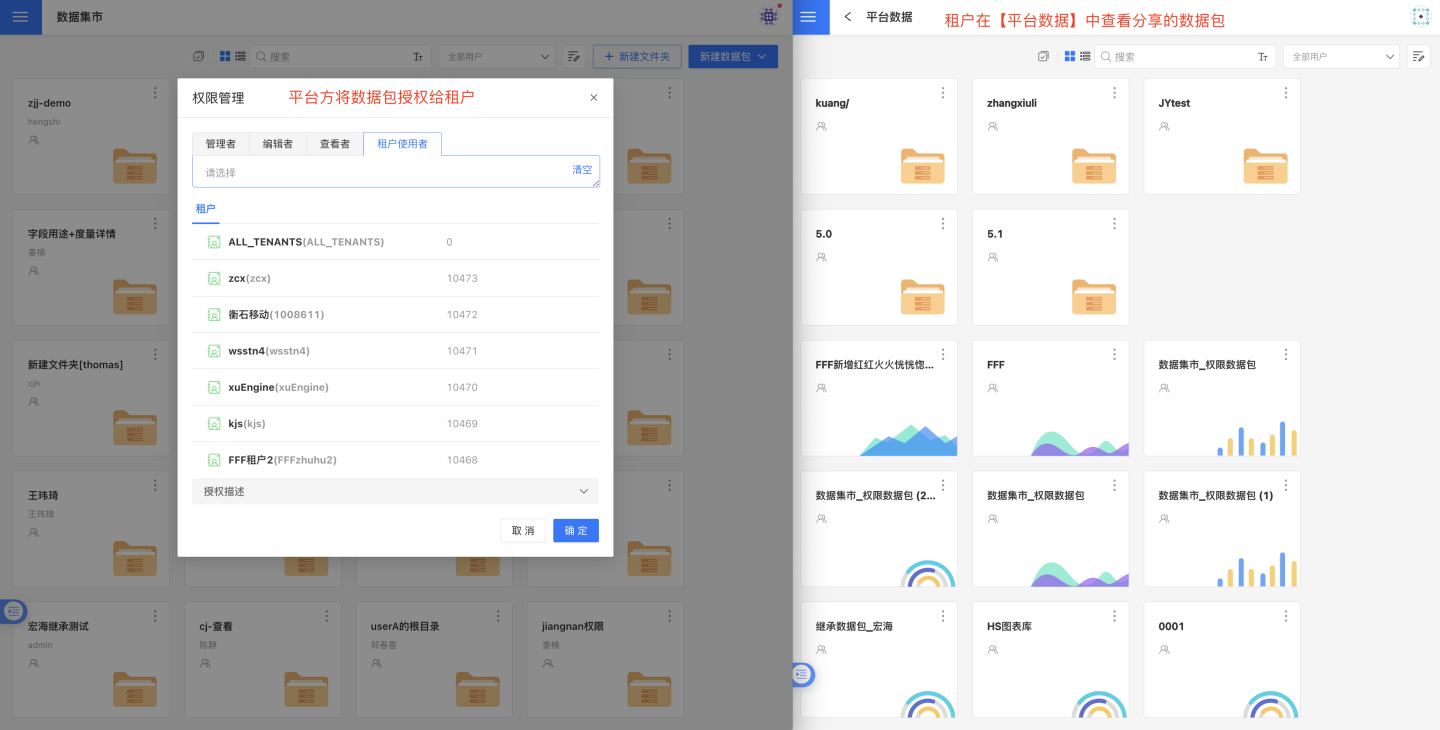 平台方将数据集市中的数据包授权给租户,租户可以查看、使用数据包中的数据。分享的数据包存放在租户系统数据集市的平台数据文件夹下。