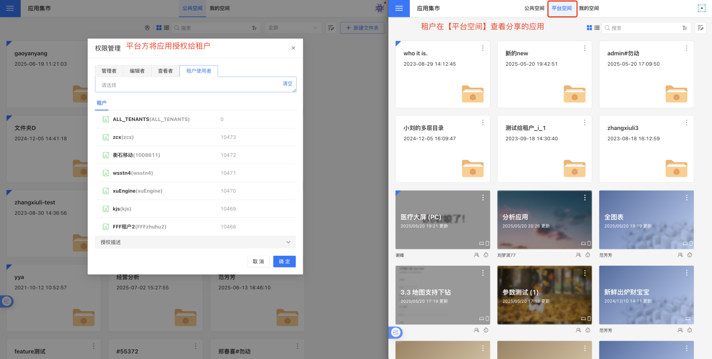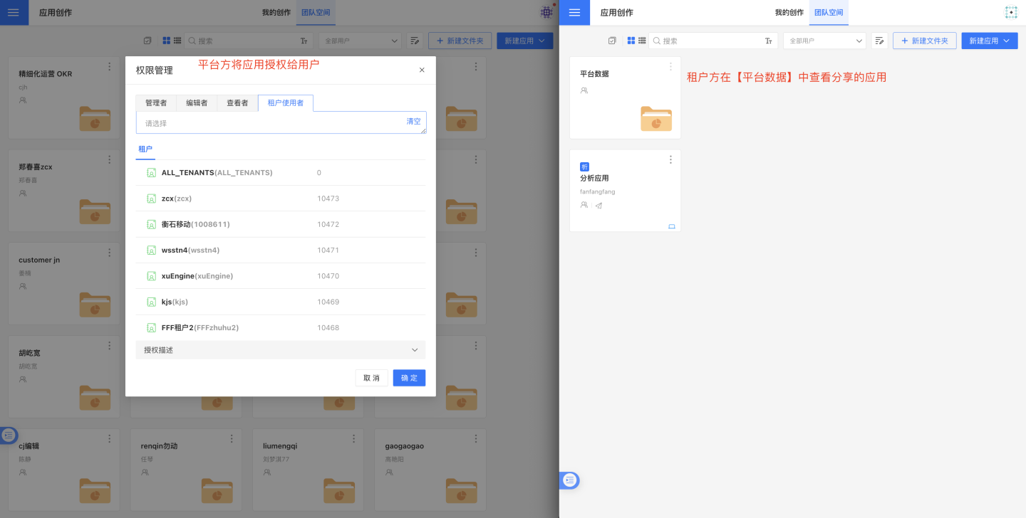 - 租户系统中的管理员可以对分享的应用进行二次授权,授权给租户系统内其他用户查看。