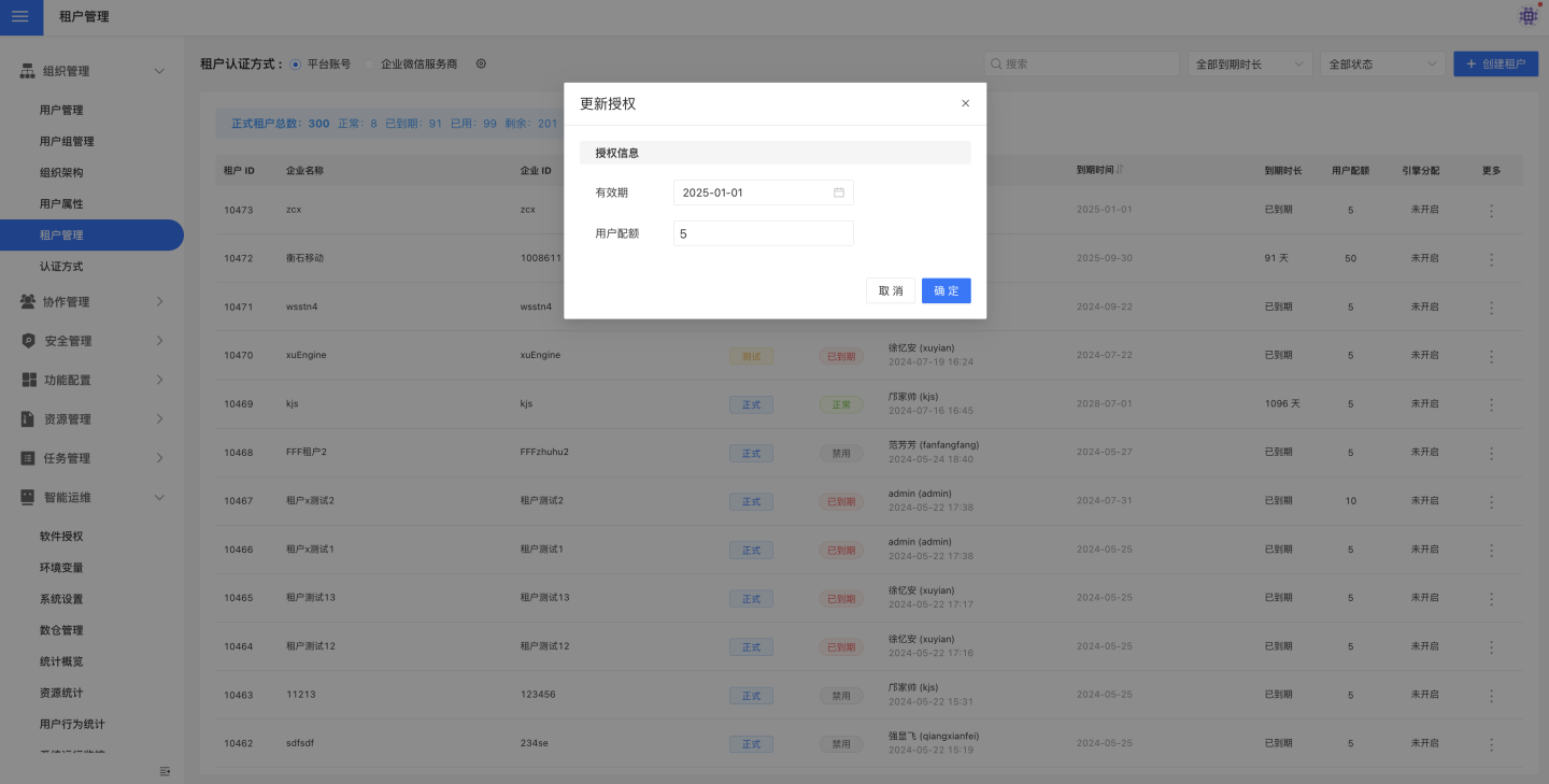 平台方可以重置租户授权信息,修改有效期和用户配额数量。