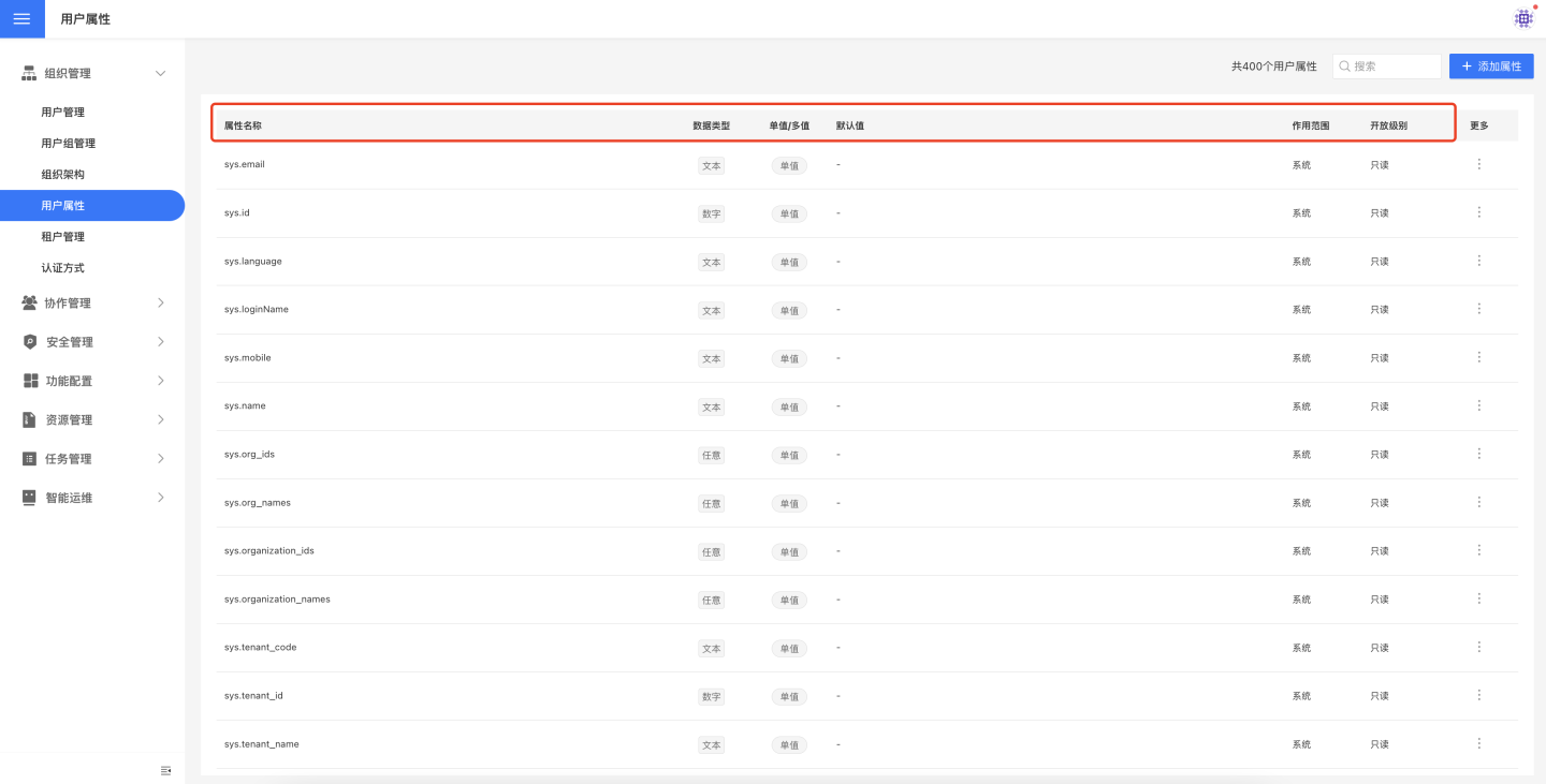 系统属性前缀为 sys.,是系统提供的属性,这些属性不可添加、编辑、删除。