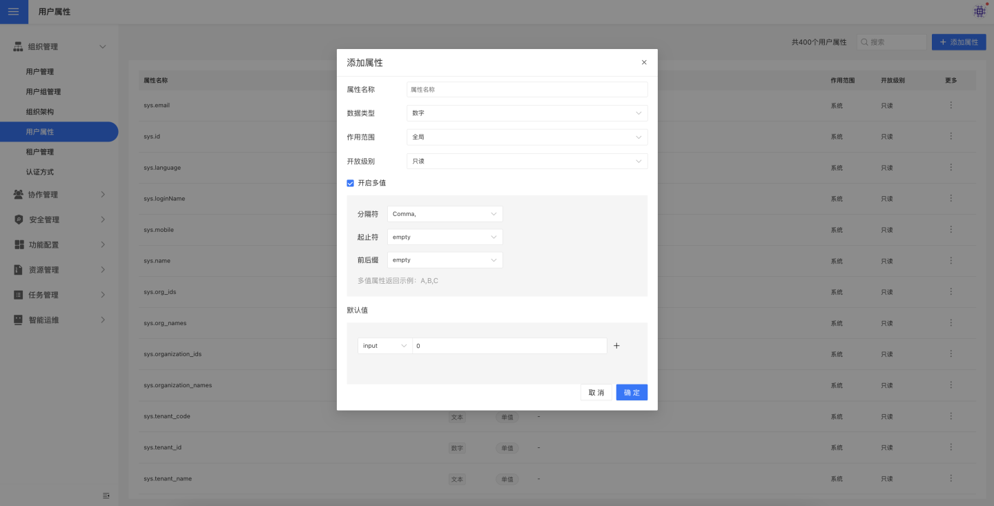 点击添加属性,在弹窗中输入属性名称、类型、作用范围、开放级别,手动输入属性的默认值,支持设置空值和 NULL 值。用户属性支持进行多值设置。