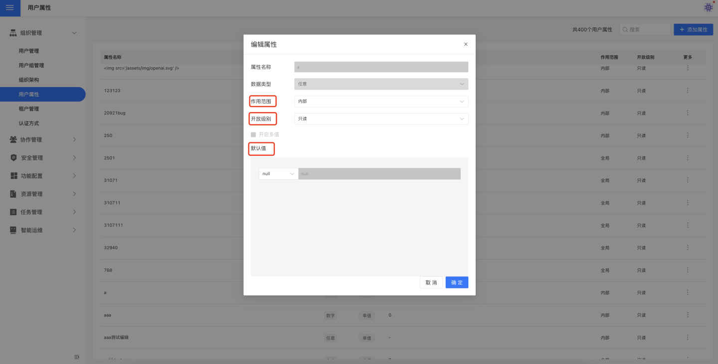 用户属性支持编辑修改,点击每个属性右侧的编辑页面,编辑自定义属性。自定义属性仅支持修改作用范围、开放级别、默认值。