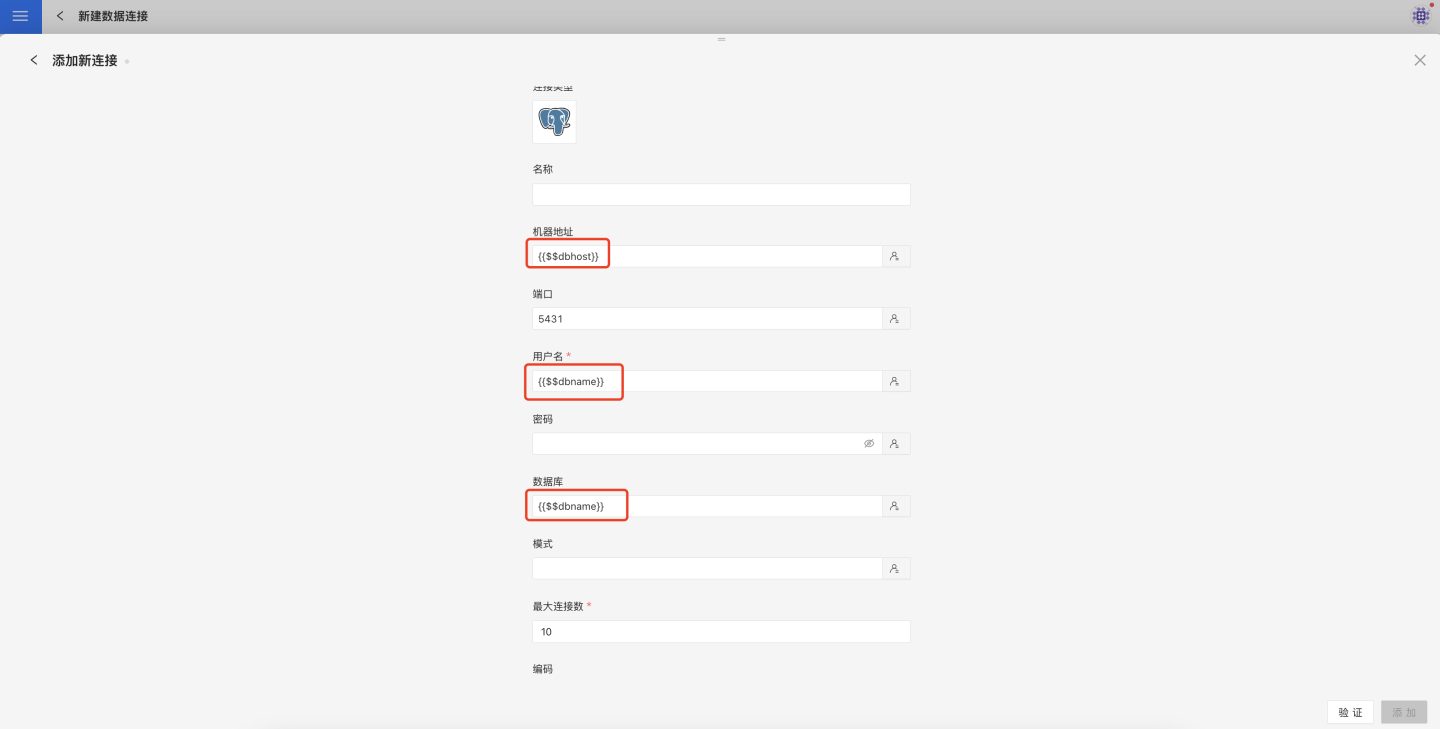 在创建连接时必须使用用户属性值{{$$用户属性名}}的形式。