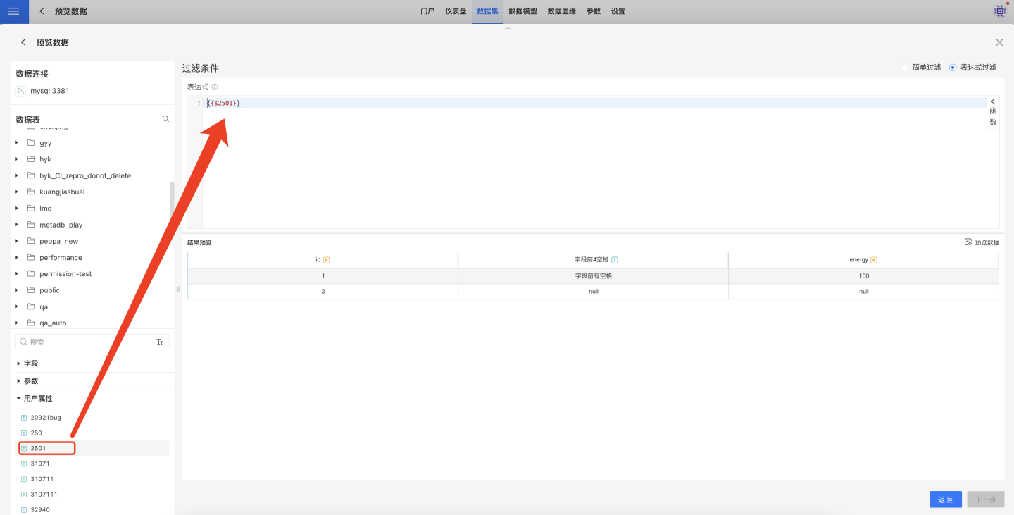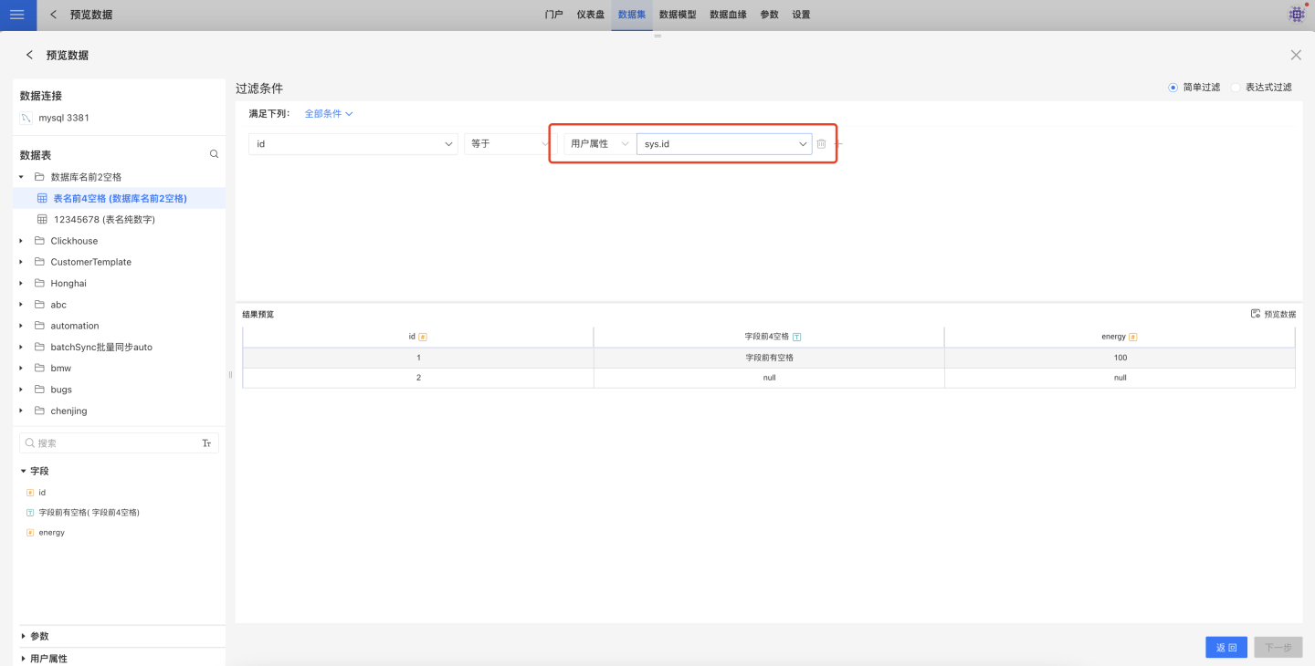 新建数据集的过滤条件中使用用户属性